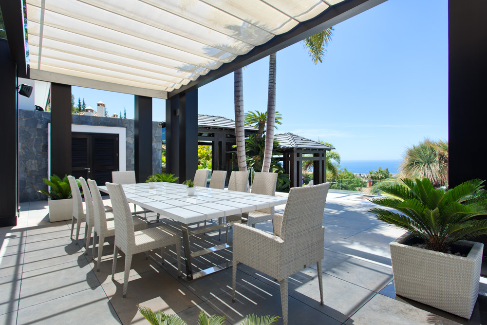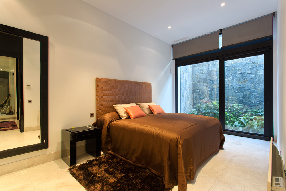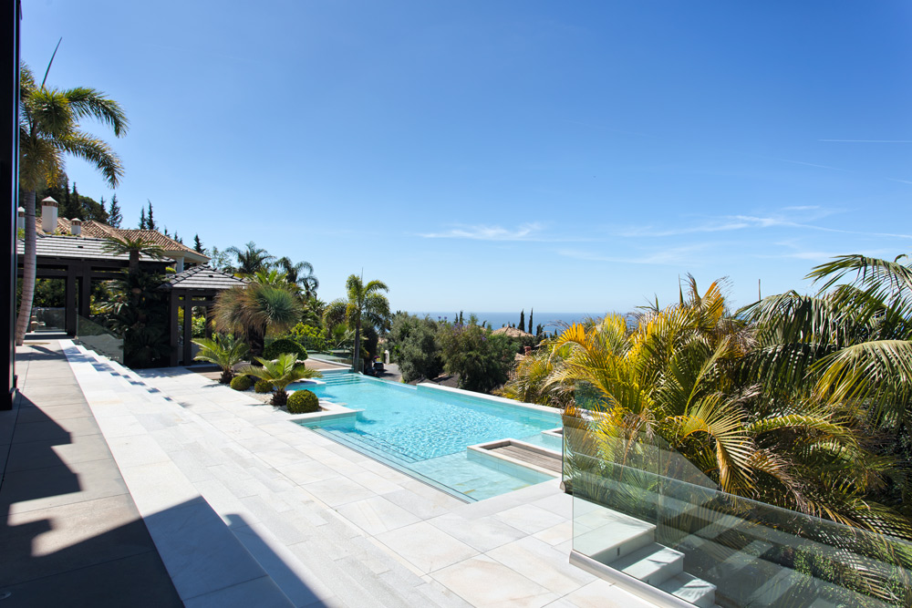 Overview: Top quality modern design, nicely situated on an elevated plot with spectacular sea views. Very quiet and private, still close to Marbella town and the beach. A driveway leads to the main entrance of the house. A grand hallway brings to the living and dining area and the fully fitted open plan kitchen. Direct access to the covered and open terraces, bbq and pool area with 3 different style pools (heated) all fit for outside living and relaxing. Upstairs a huge master bedroom en suite with dressing area, fitness and salon/bar and one guest bedroom en suite. Lower floors. Four bedrooms en suite, one fully fitted guest or staff apartment with two bedrooms and one bathroom, spa area with steam room, office, possible cinema room and garage for 4 to 5 cars. Fully fitted domotica system, B&O surround, under floor heating, A/C, elevator to all floors, outside parking. Gated community with 24hrs. security..