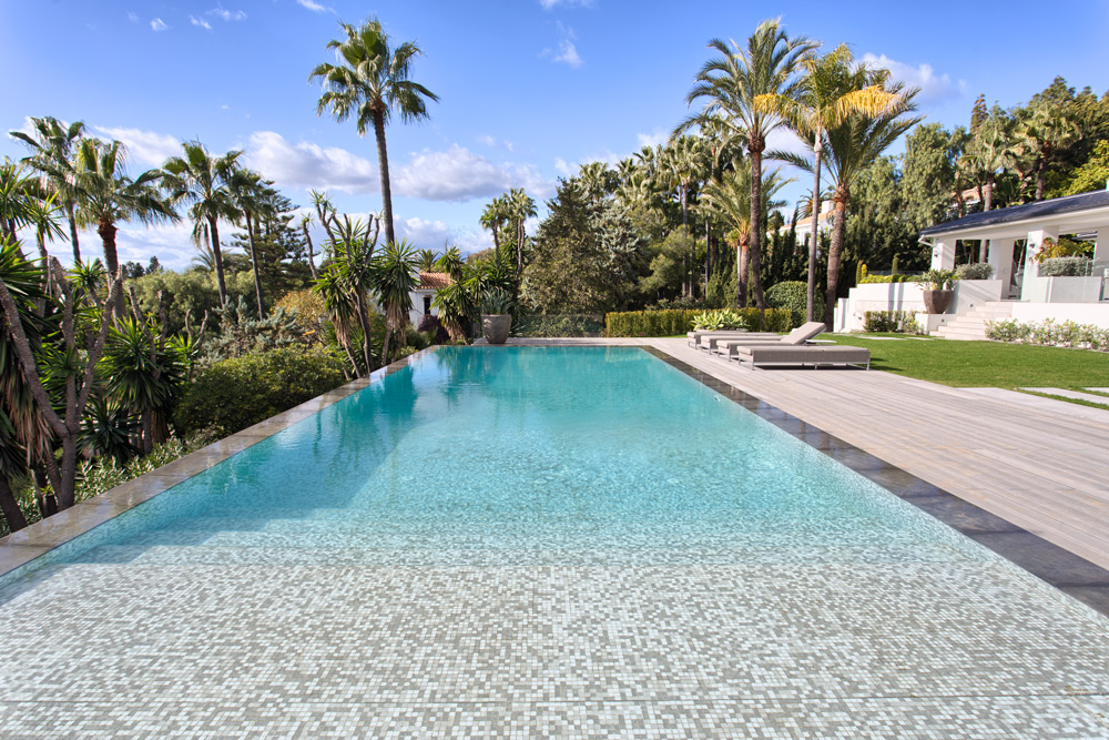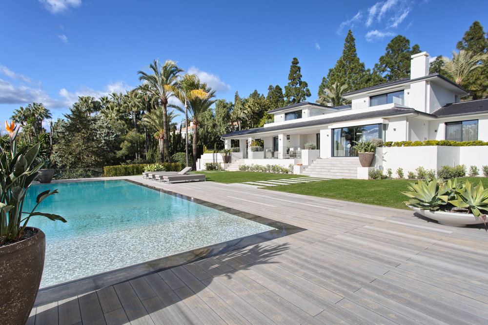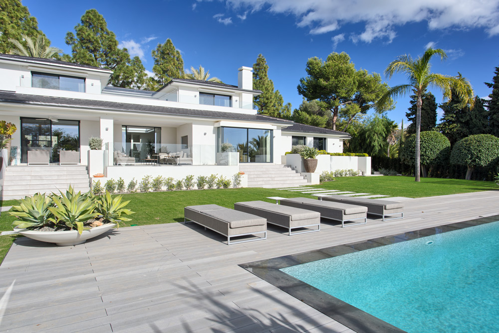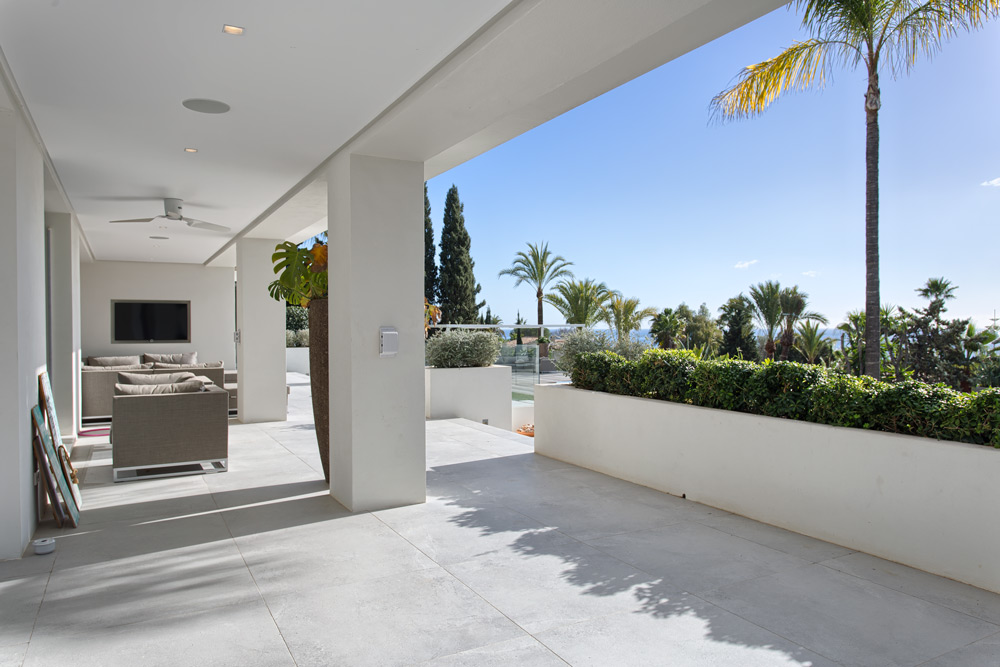 Overview: Recently renovated top quality villa in the residential area of Hacienda Las Chapas. South to southwest facing, quiet and private. Stunning sea views. Main floor: Entrance hallway, spacious living and dining area with high ceilings and fully fitted open plan kitchen (Danespan with Miele appliances). Direct access to the terraces, garden and pool. Master bedroom suite, one guest bedroom and bathroom. First floor: Two guest bedrooms en-suite with own terraces. Lower floor: One bedroom with bathroom and a small kitchen, one car garage and storage. Extra area for a gym or games room. A big plot, mature gardens, infinity pool heated, A/C with heating and individual controlled, underfloor heating, integrated domotic system, sound system Sonos, outdoor kitchen and lounge area..